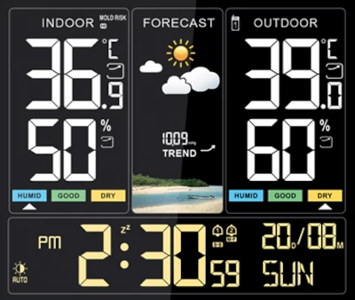 Προβάλλει τα επίπεδα θερμοκρασίας και υγρασίας, τόσο του εσωτερικού όσο και του εξωτερικού χώρου. Επίσης, προβάλλει την πρόγνωση καιρού βάσει της βαρομετρικής πίεσης και ένδειξη μέσω 6 διαφορετικών εικονιδίων.